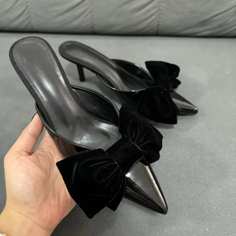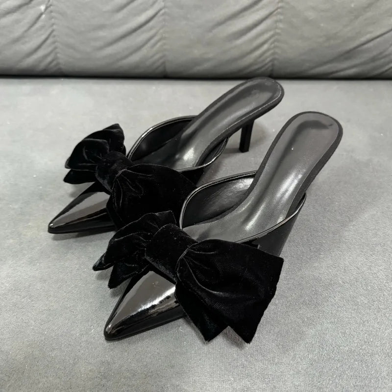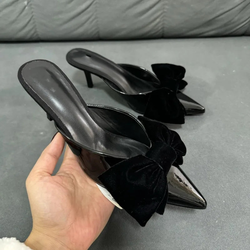 New 2024 Summer Pointed Bow Decorated With Satin Spliced With Shallow Mouth and Bare Heel Fashion Sandals