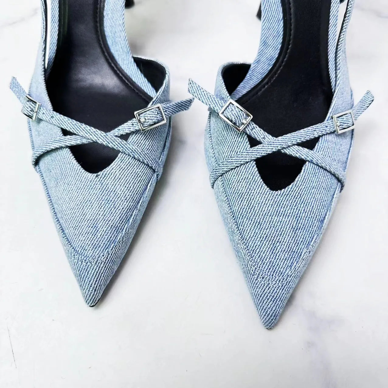 New 2024 Women's Shoes, High Heels, Denim Shallow Straps, Hollow Baotou Sexy Stiletto Fashion Sandals.