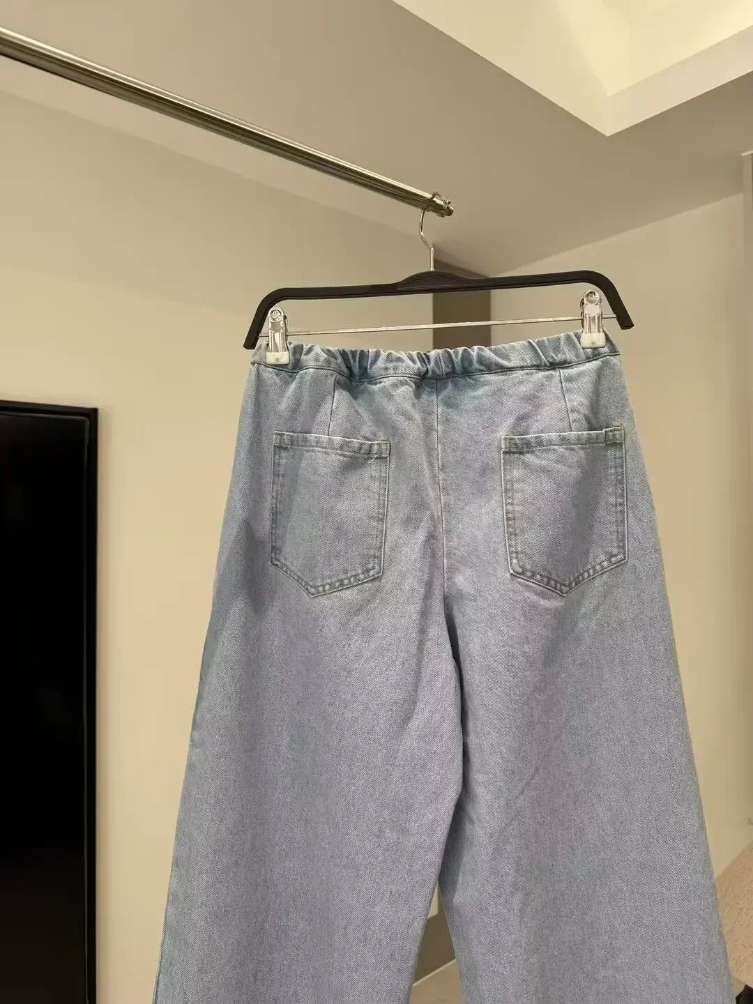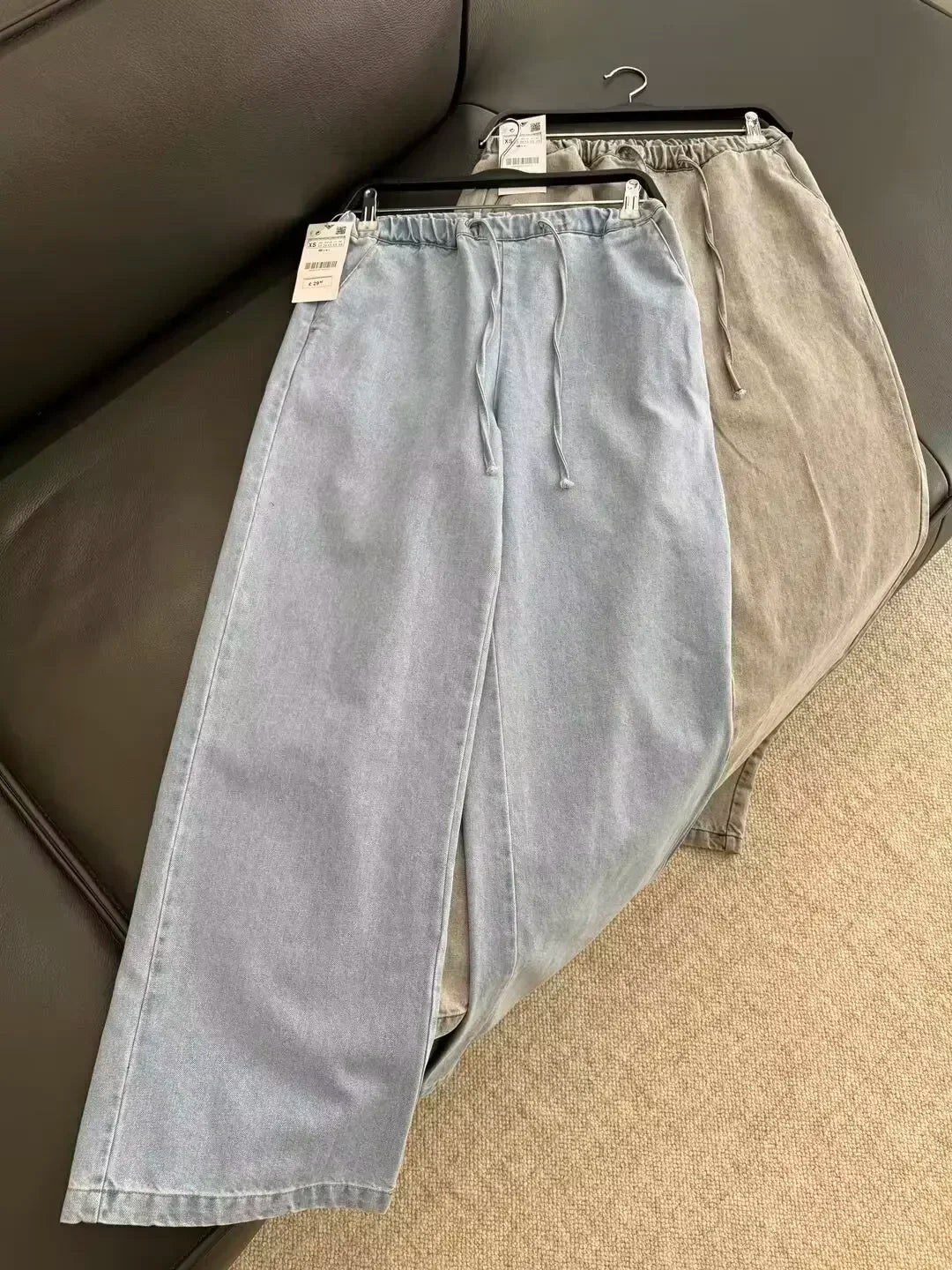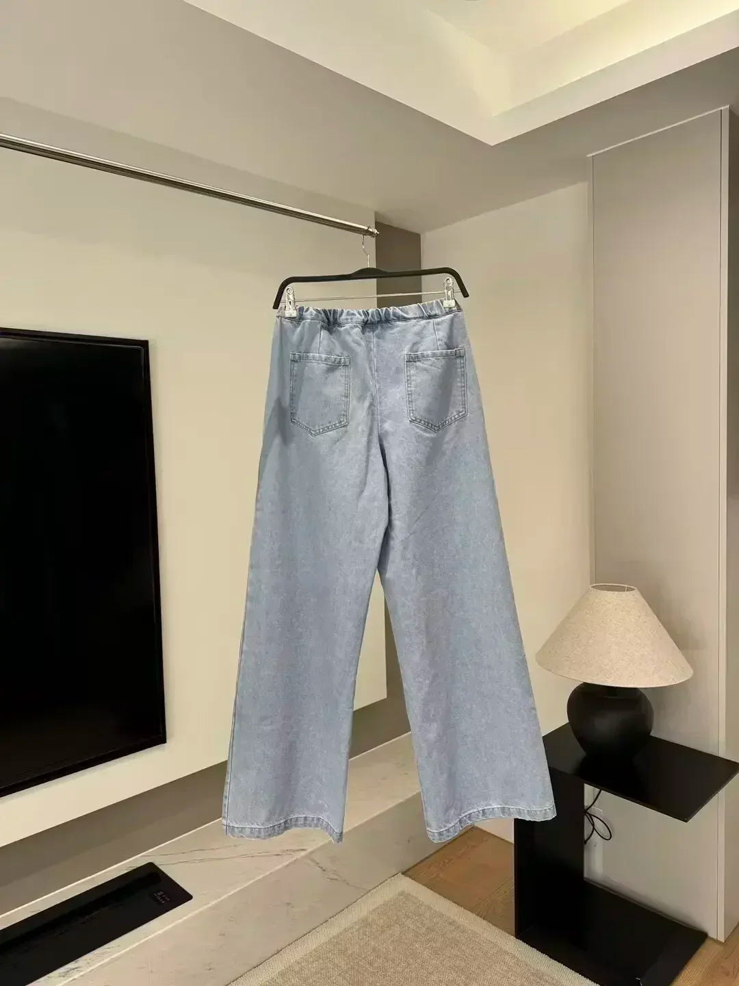 Women's 2024 New Fashion Side Pocket Decoration Loose Jogging Wide Leg Jeans Retro Elastic Waist Drawstring denim pants