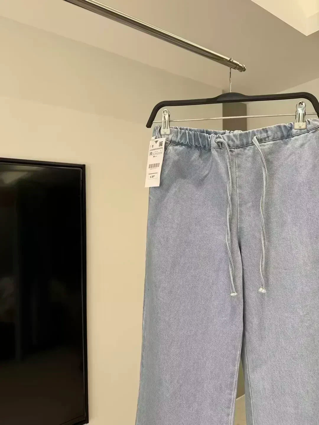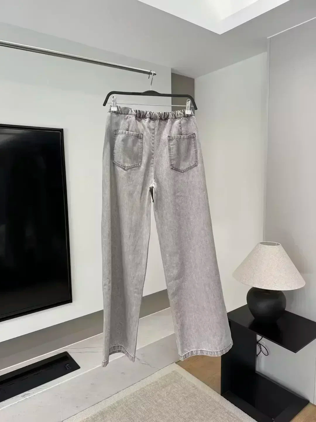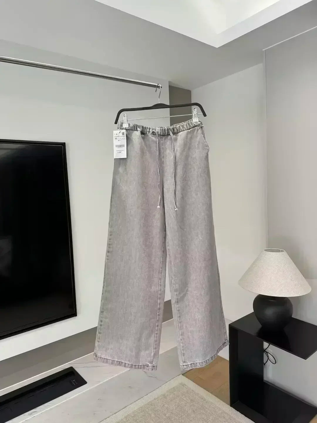 Women's 2024 New Fashion Side Pocket Decoration Loose Jogging Wide Leg Jeans Retro Elastic Waist Drawstring denim pants