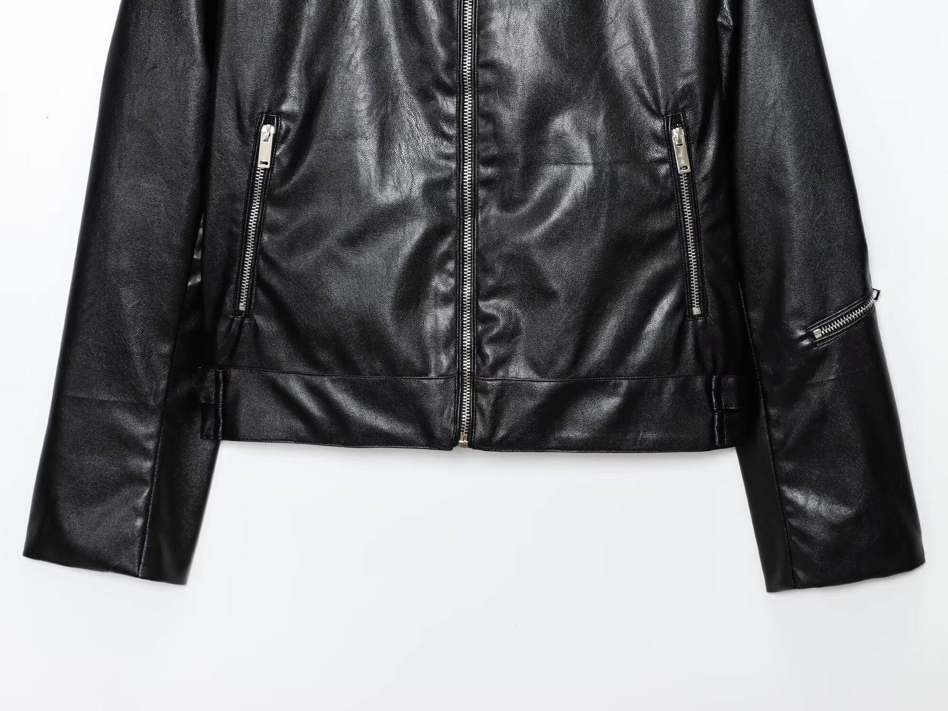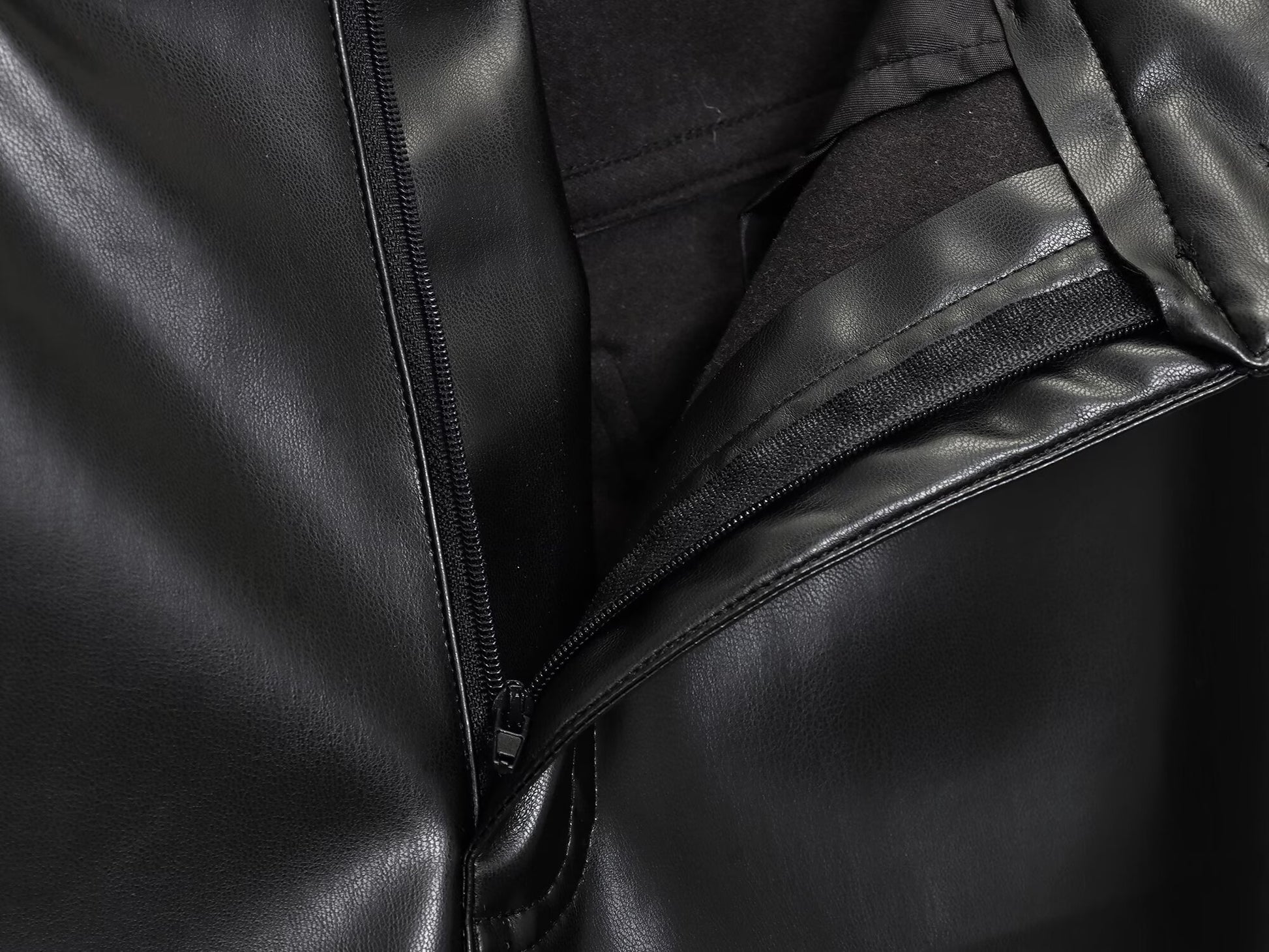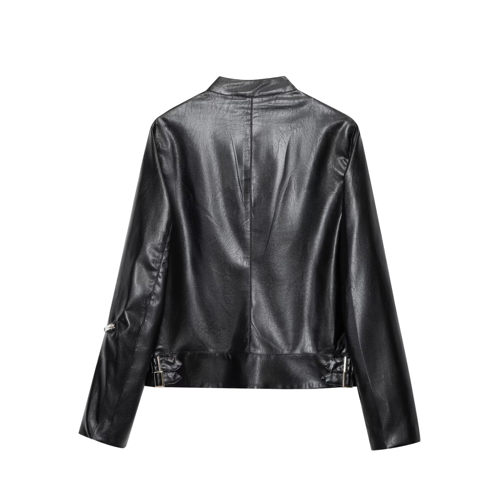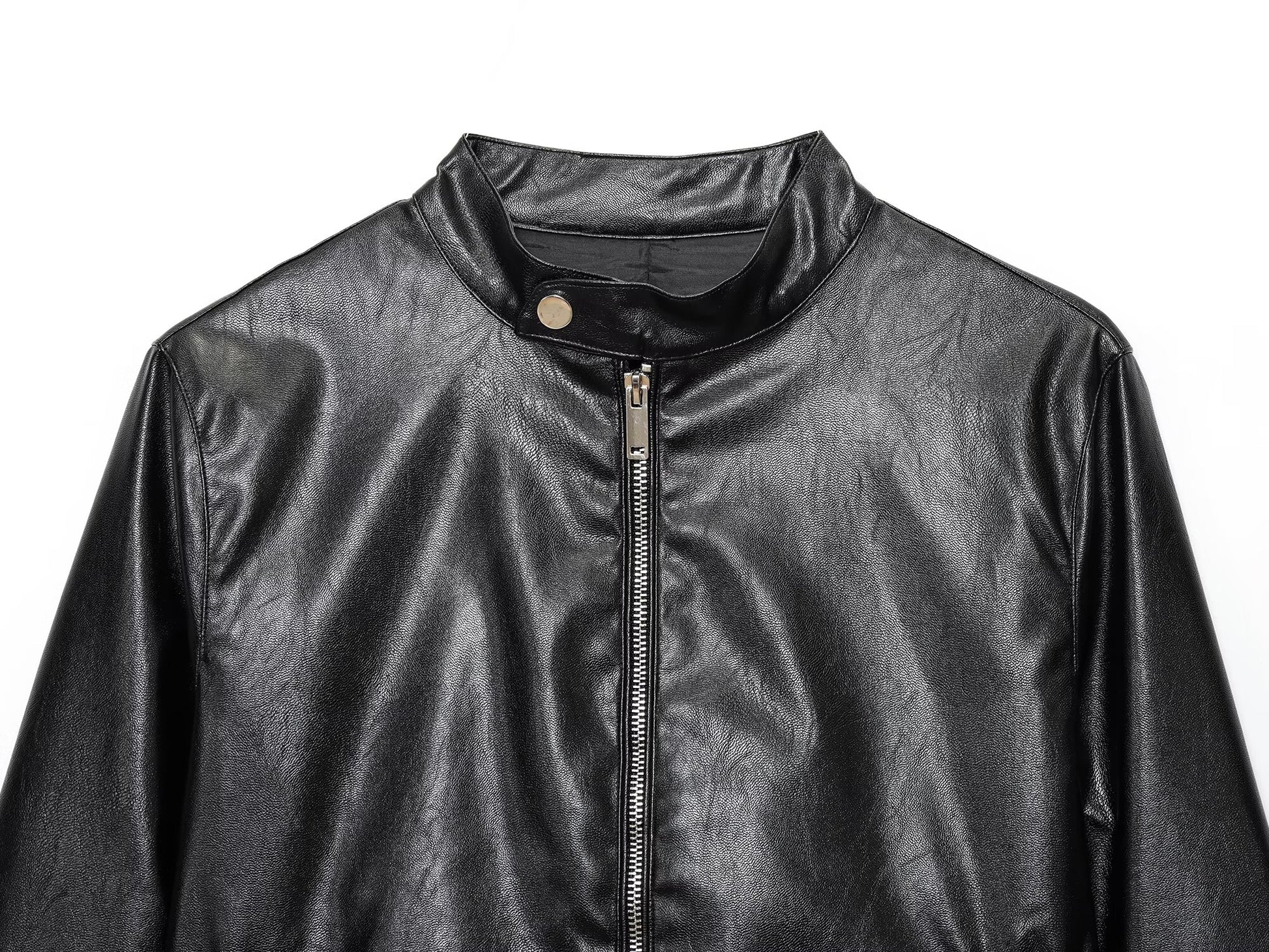Women's new fashion black stand collar Faux Leather jacket Coat+Pants suit
