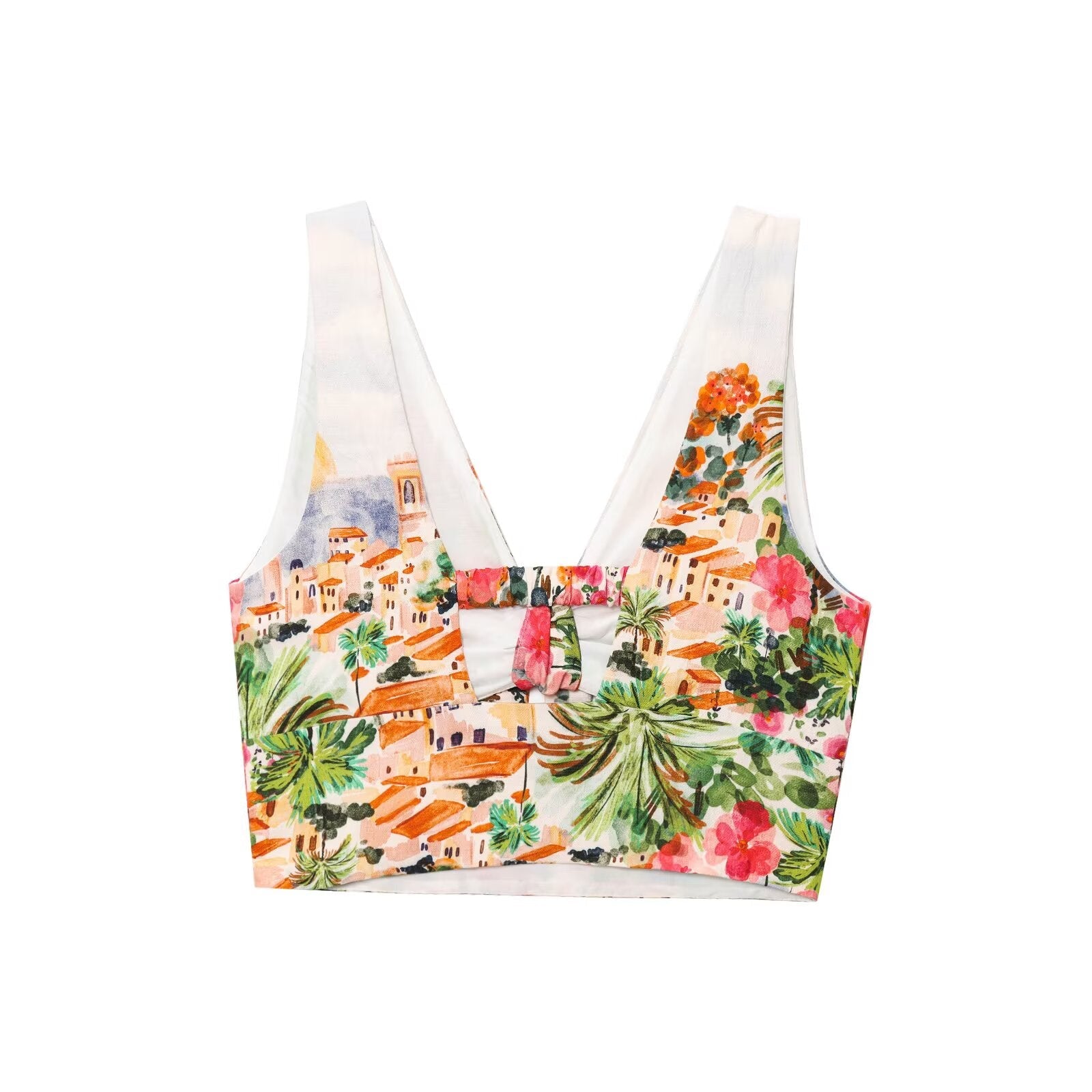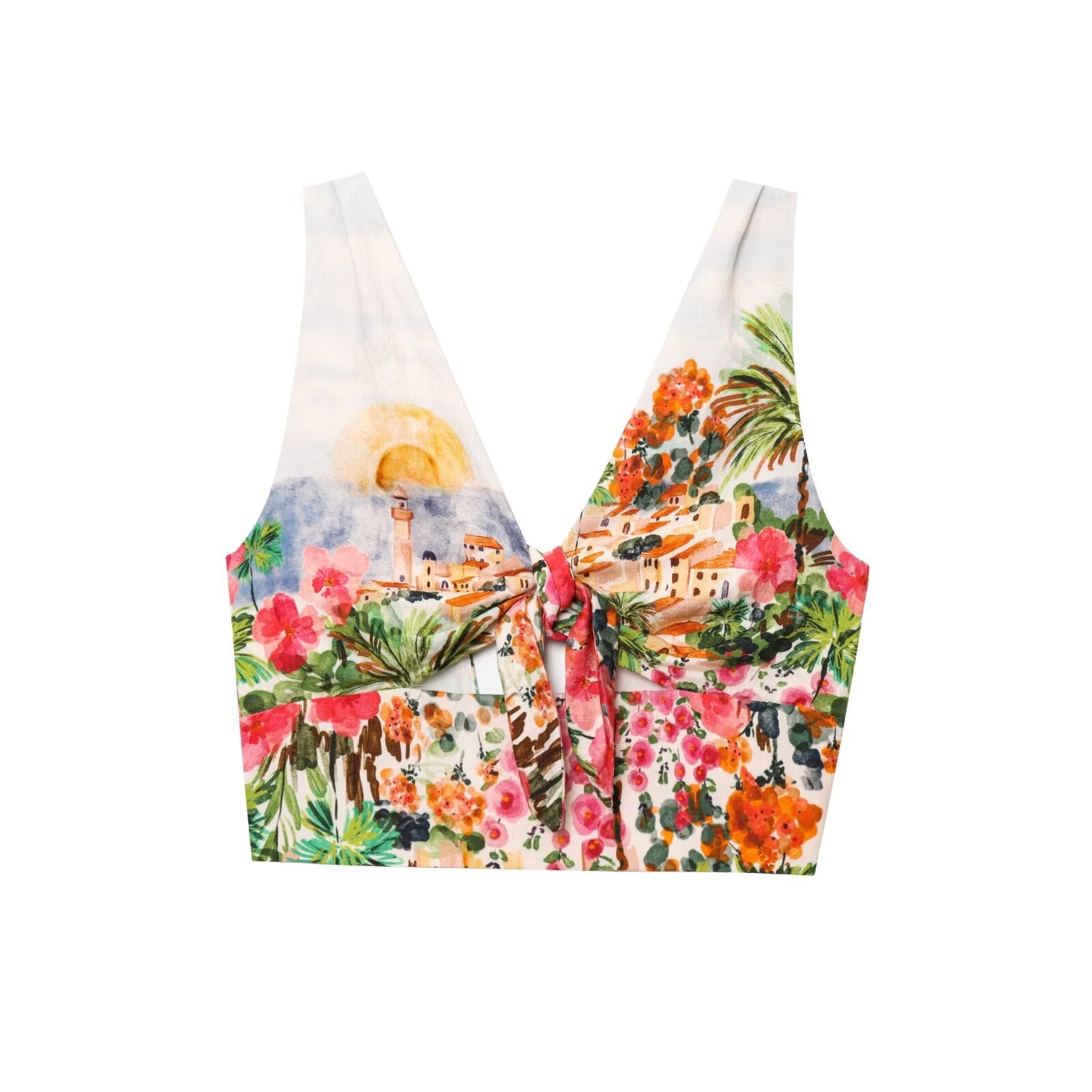 Women's new fashion knot decoration short print V-neck top+Skirts suit