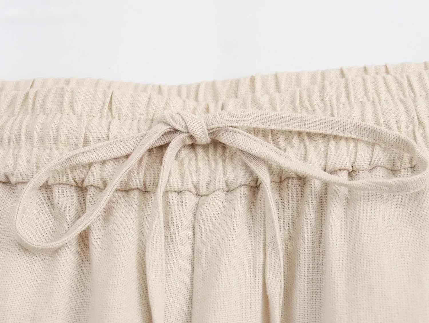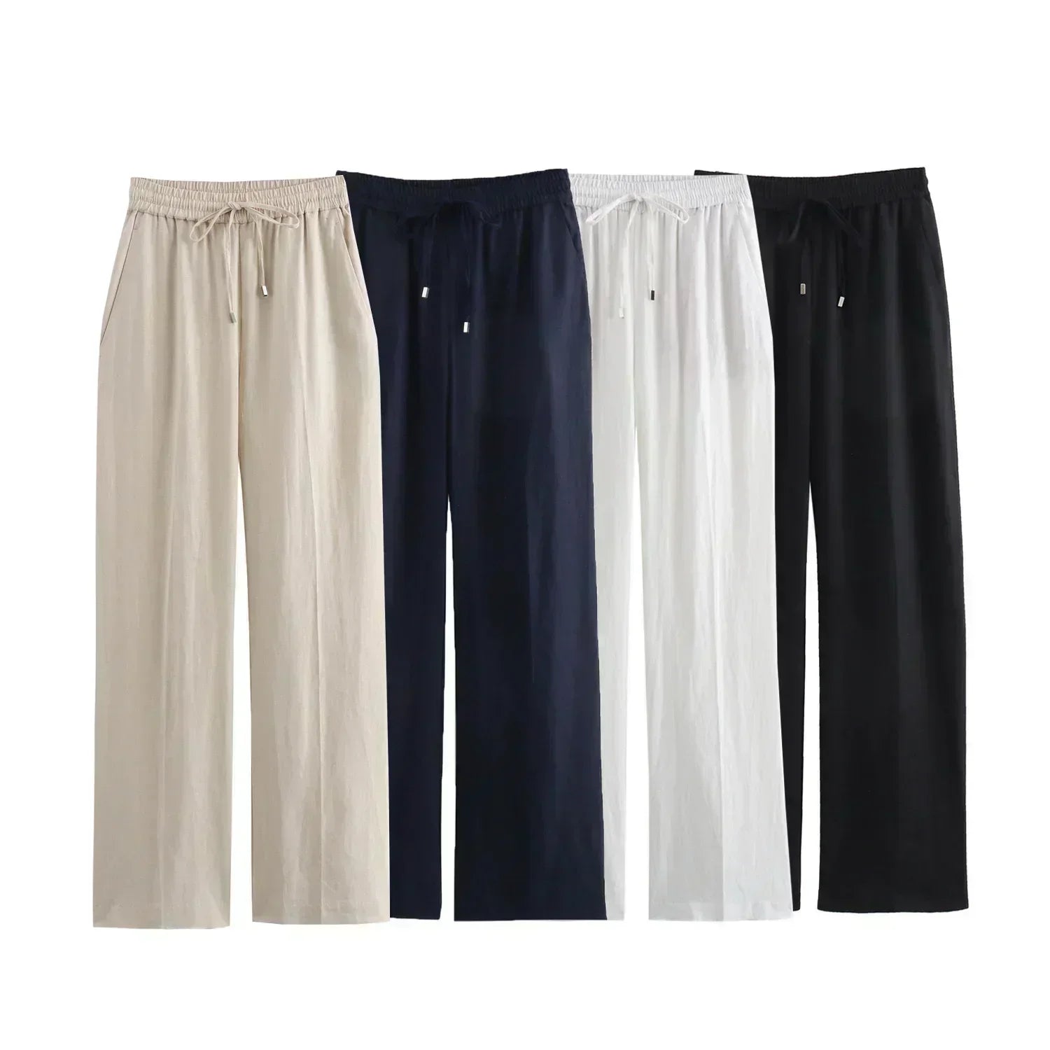 Women's New Fashion Loose Side Pocket Linen Blended Straight Leg Casual Pants Retro Elastic Waist Drawstring Women's Pants