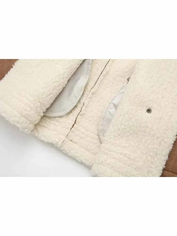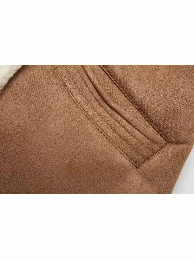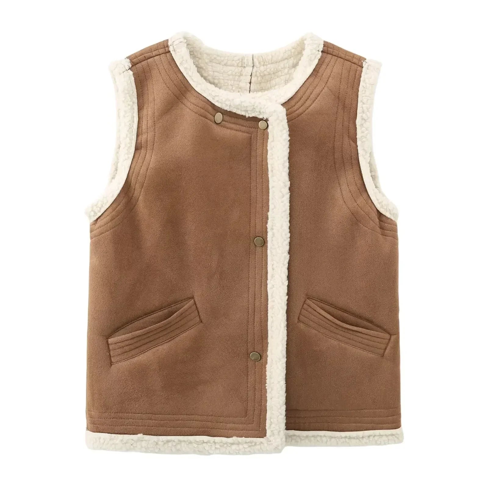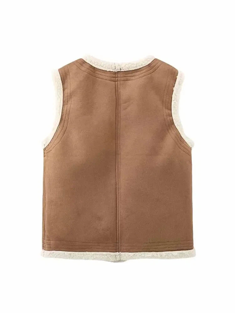 Women's new fashion pocket decoration casual O-Neck Faux Leather lambhair vest retro sleeveless button up women's vest chic top