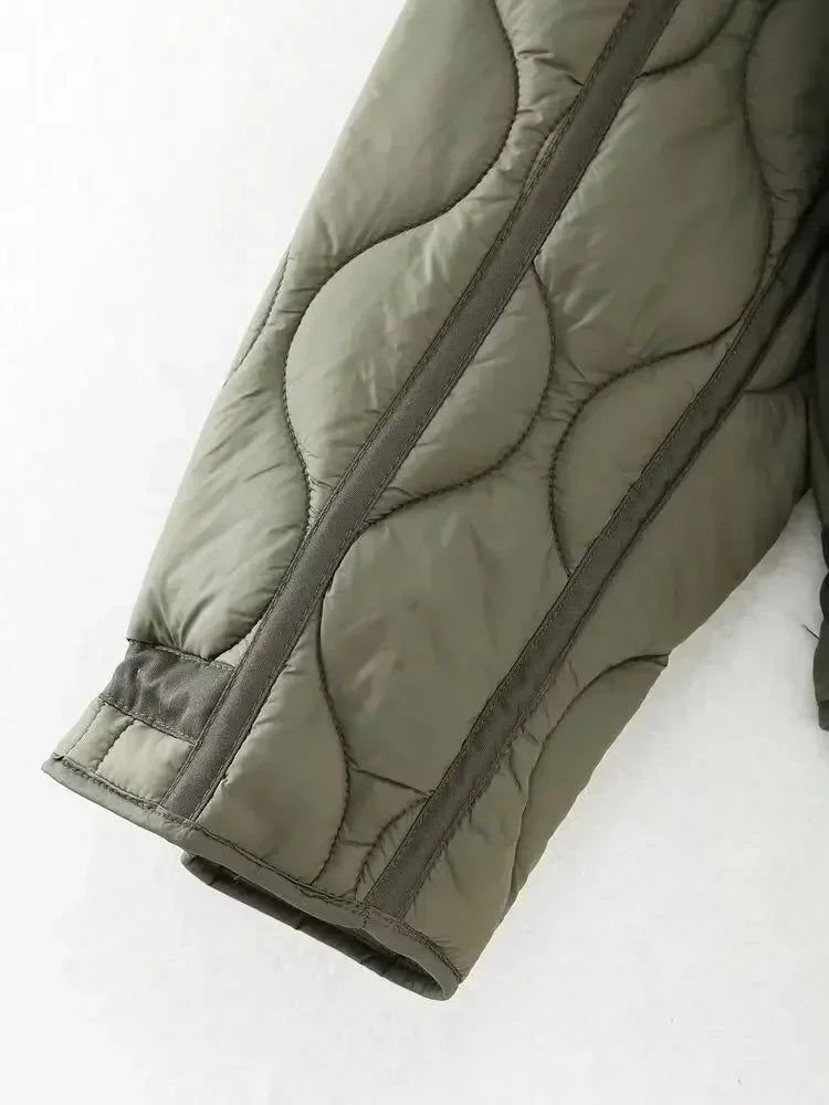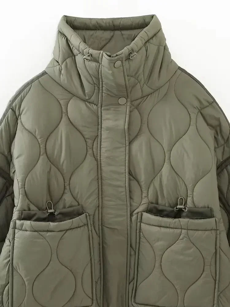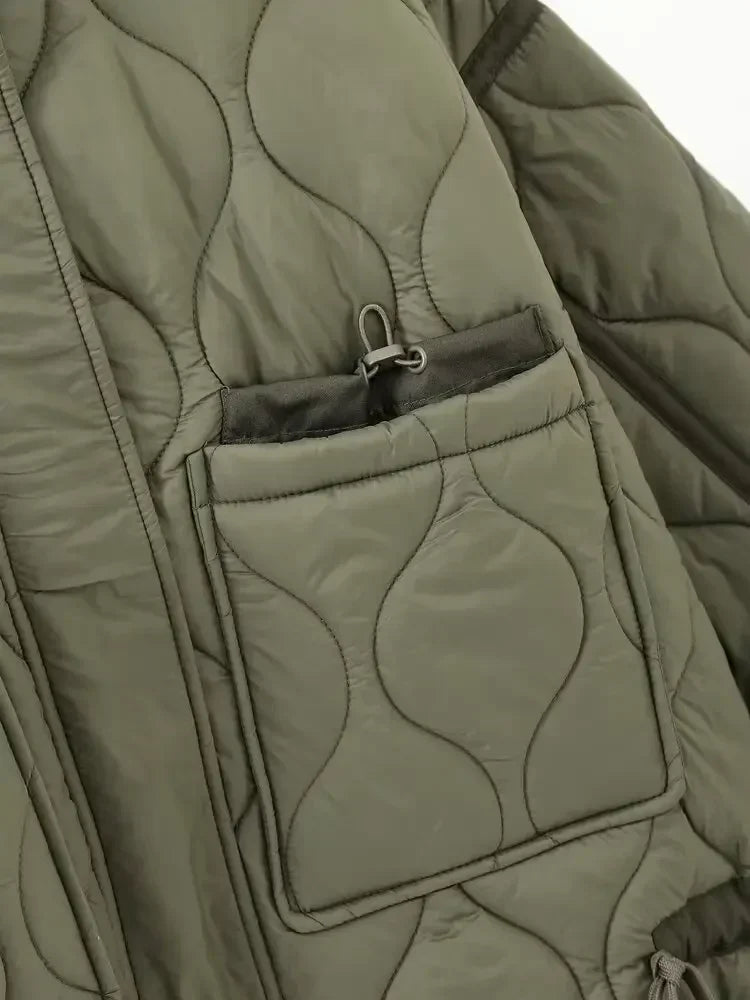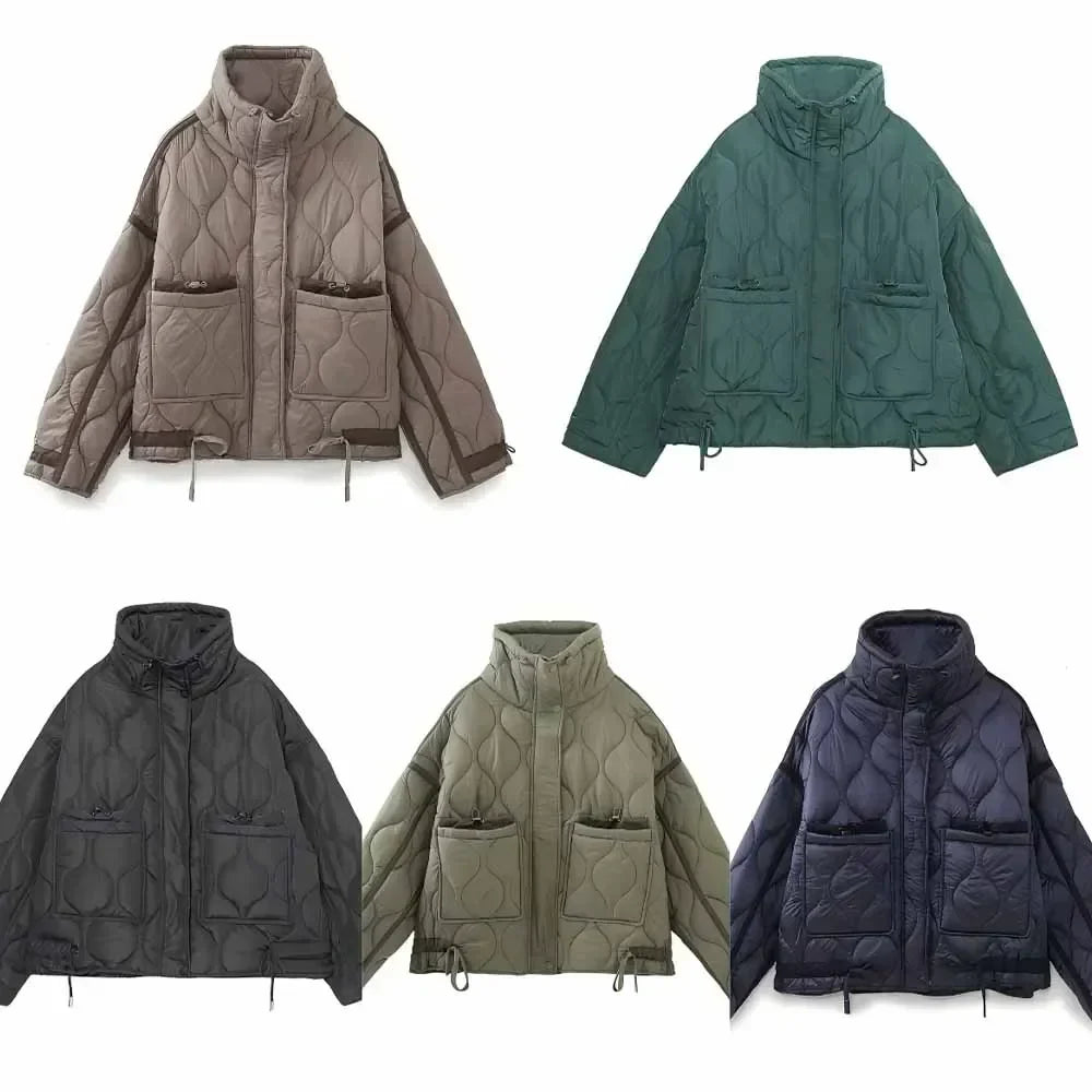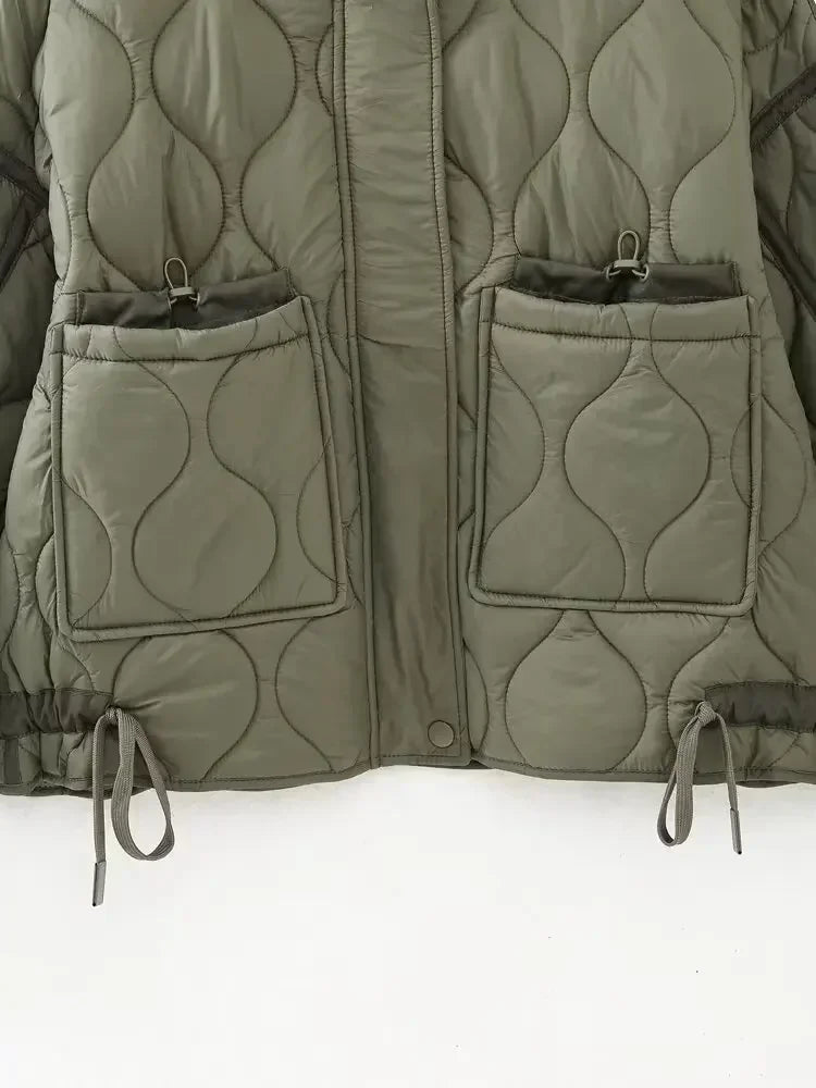 Women's winter fashion drawstring pocket decoration loose stand Neck cotton jacket Coat retro long sleeved women's coat chic top